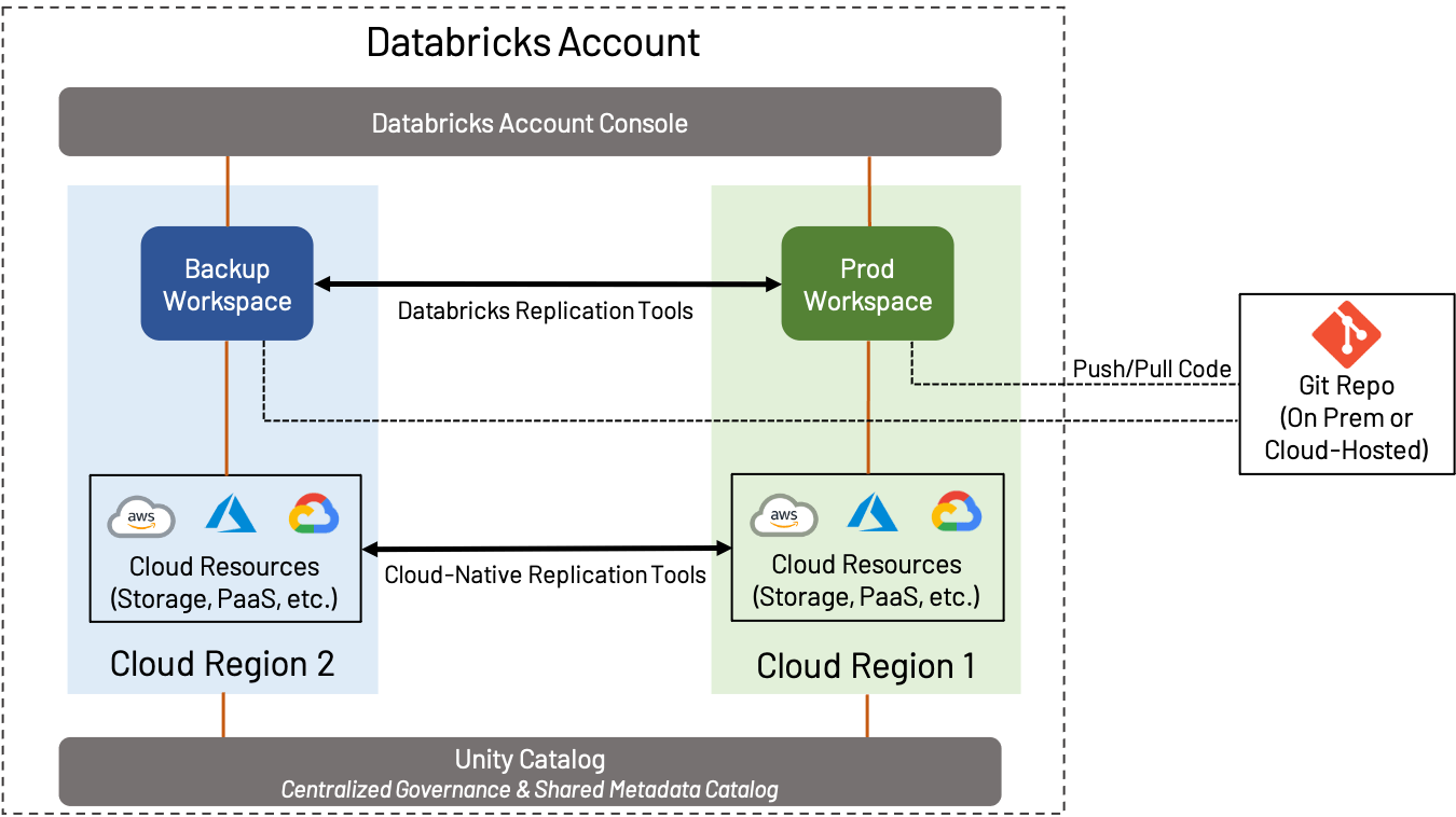 AWS、Azure、またはGCPのいずれを使用する場合でも、災害復旧(DR)は重要な広範なトピックです。このブログではすべてを網羅しませんが、代わりに DR とリージョンに関する考慮事項がワークスペース設計にどのように影響するかを中心に説明します。この文脈では、DR は標準の運用ワークスペースとは別のリージョンにワークスペースを作成および維持することを意味します。