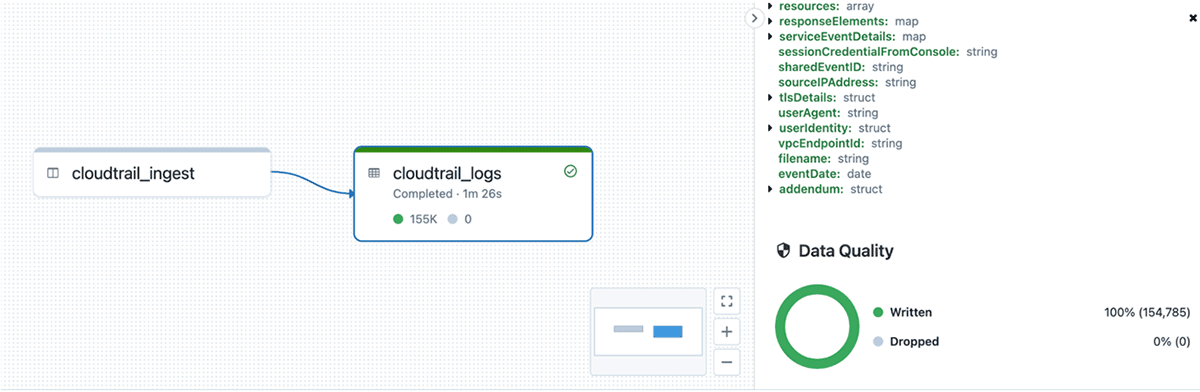 各パイプラインのコードを数行書くだけで、最適化され、構造化されたセキュリティレイクハウスができあがり、元の生データよりもはるかに効率的になります。これらのパイプラインは、必要な頻度で実行できます。低レイテンシーの場合は連続的に、1時間ごとや1日ごとなどの定期的に実行することも可能です。DLTは必要に応じてパイプラインの拡張や再試行を行い、複雑なエンドツーエンドのスキーマの進化も管理してくれるため、サイバーレイクハウスの維持に必要な運用負担は大幅に軽減されます。