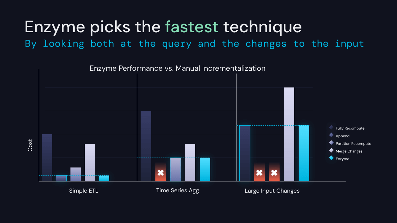 ETLの新しい最適化レイヤーであるProject Enzymeを開発していることを発表できることを嬉しく思います。Enzymeは、Deltaテーブルに格納された指定されたクエリの結果のマテリアライゼーションを効率的に最新の状態に保ちます。コストモデルを使用して、従来の具現化ビュー、delta-to-deltaストリーミング、および顧客が一般的に使用する手動ETLパターンで使用される技術を含む、さまざまな技術の中から選択します。