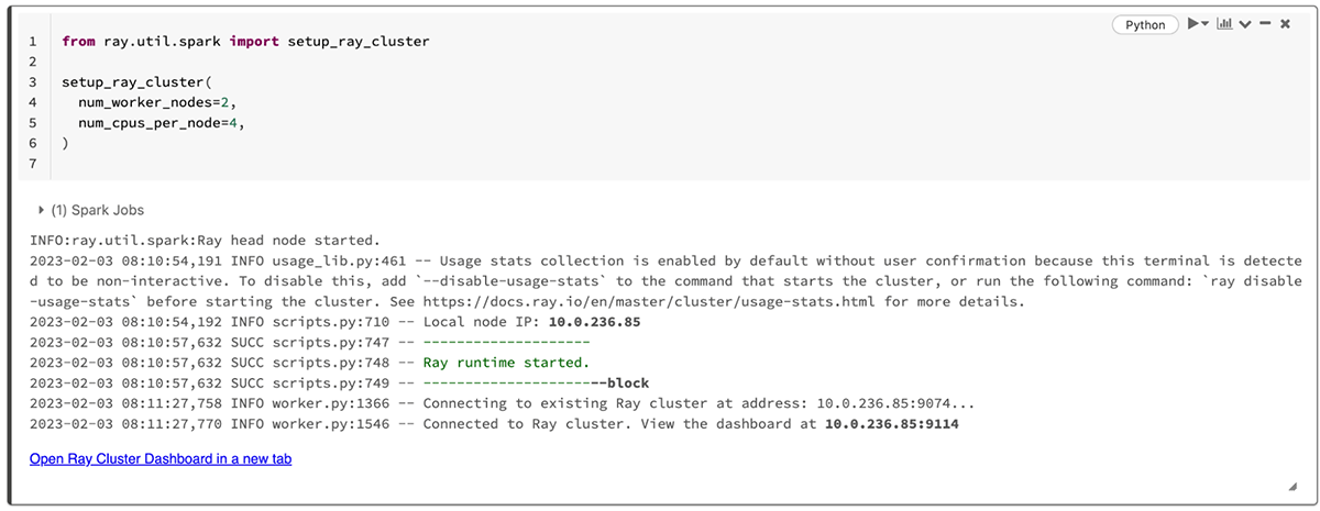 DatabricksまたはSparkクラスタでRayを起動するには、Rayの最新バージョンをインストールし、Ray.util.spark.setup_ray_cluster()関数を呼び出してRayワーカーの数と計算リソースの割り当てを指定するだけです。Databricks Runtimeバージョン12.0以上のDatabricksクラスタと、バージョン3.3以上のSparkクラスタがサポートされています。例えば、以下のコードはDatabricksノートブックにRayをインストールし、2つのワーカーノードを持つRayクラスターを初期化します: