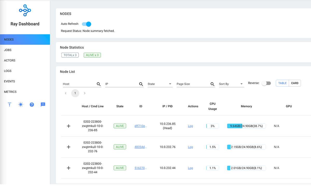 Rayダッシュボードでは、Rayクラスタのノード、アクター、メトリクス、イベントログを包括的に表示することができます。個々のノードのリソース利用メトリクスを簡単に表示したり、すべてのノードのメトリクスを集計したりすることができます。Rayダッシュボードの詳細については、Ray dashboard documentationをご覧ください。