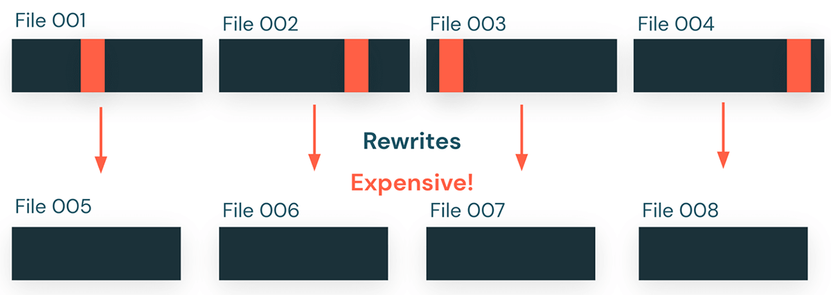 Figure 1: UPDATE操作により、影響を受けていないデータを新しいファイルに書き換えるという高価な作業が発生します