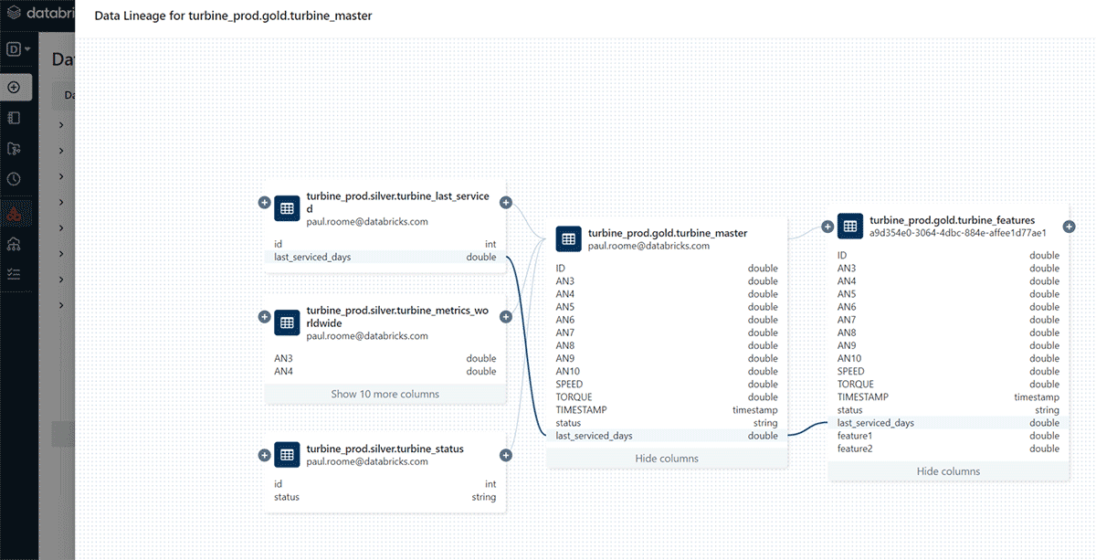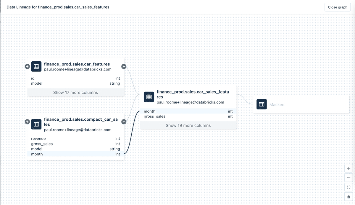 統一されたカラムとテーブルの系統グラフ:Unity Catalog では、1 つの系統グラフで列と表の両方の系統を確認できるようになり、特定の表や列が何で構成され、データがどこから来るのかをよりよく理解できるようになりました。ユーザーは、数回のクリックで、上流または下流の系統グラフを移動し、完全なデータフロー図を見ることができます。