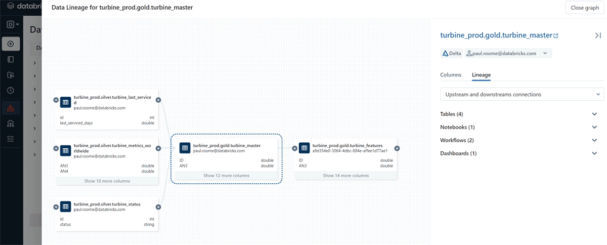Unity Catalog でデータリネージを自動化することで、データチームは、コンプライアンス要件や監査レポートのために機密データを自動的に追跡し、全てのワークロードでデータ品質を確保し、レイクハウス全体でデータ変更の影響分析や変更管理を行い、データパイプラインのエラーの根本原因分析を実施できるようになりました。データリネージの一般的な使用例については、以前のブログで詳しく説明しています。
