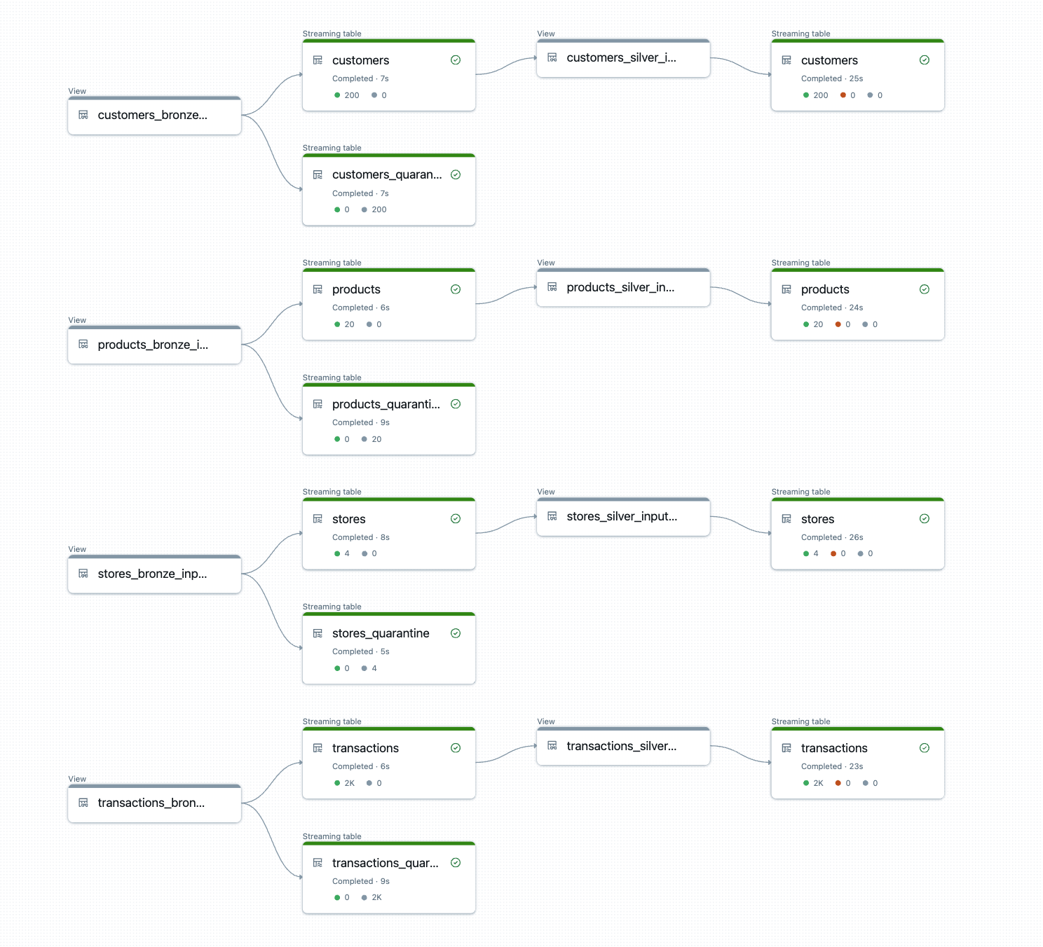 出力は、一貫した変換、品質ルール、およびリネージが自動的に適用された、本番運用対応の bronze テーブルと silver テーブルです。