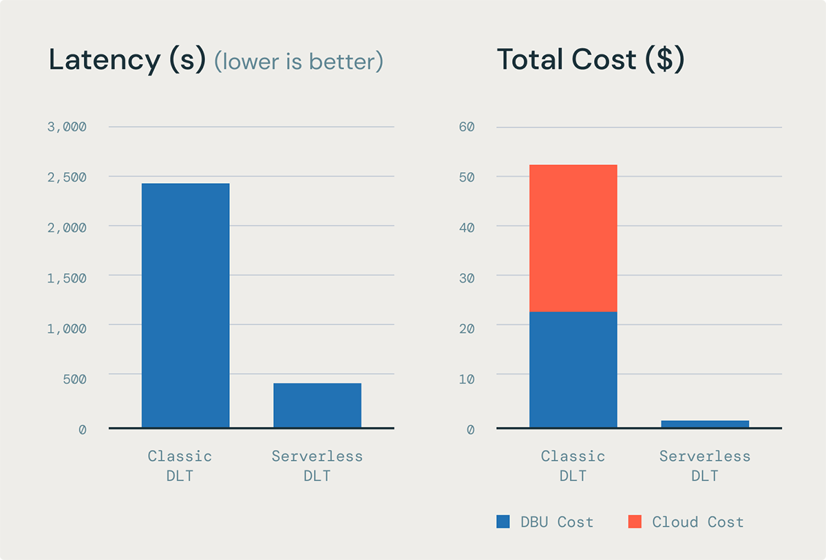 Serverless DLT provides 85% lower latency for MV refreshes, at 98% lower cost than DLT on classic compute