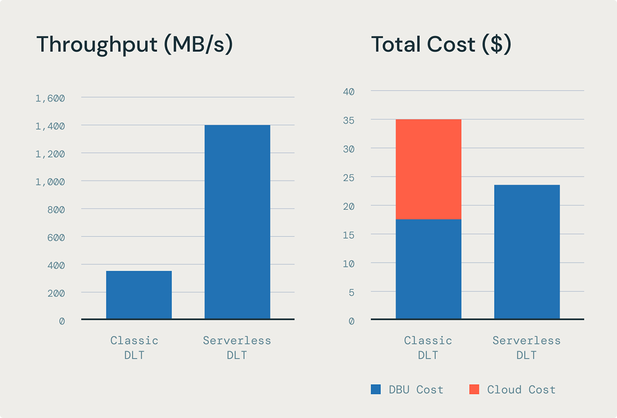 Serverless DLT provides 4x better throughput for ingestion workloads, with 32% lower TCO than DLT on classic compute