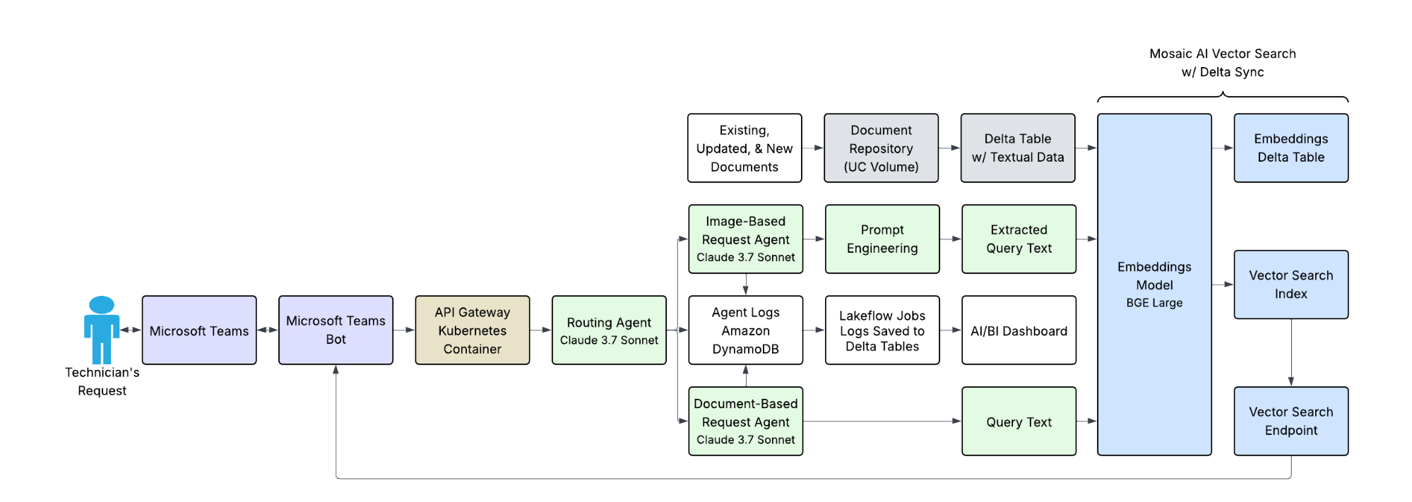 • 技術者はTeams内で自然言語クエリーを使用できます。Databricks Model Serving経由のClaude 3.7 Sonnetを使用して、システムはこれらのクエリーをベクトル埋め込みに変換し、インデックスを検索し、検索拡張生成(RAG)を用いて文脈を考慮した回答を返します。技術者は、長いマニュアルや機器ガイドからでも即座に回答を受け取ることができます。