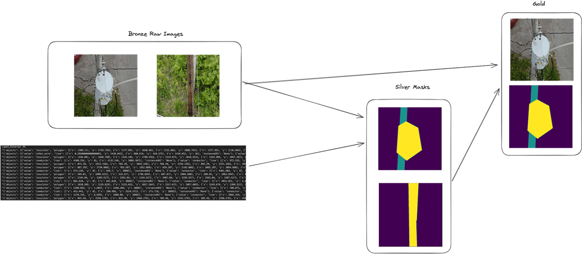 データは、配電資産の画像と各オブジェクトのラベルで構成されるEPRIデータセットから取り込まれます。 これらはDeltaテーブルに取り込まれ、メダリオンアーキテクチャを通して変換され、モデルトレーニングに適したデータセットが生成されます。