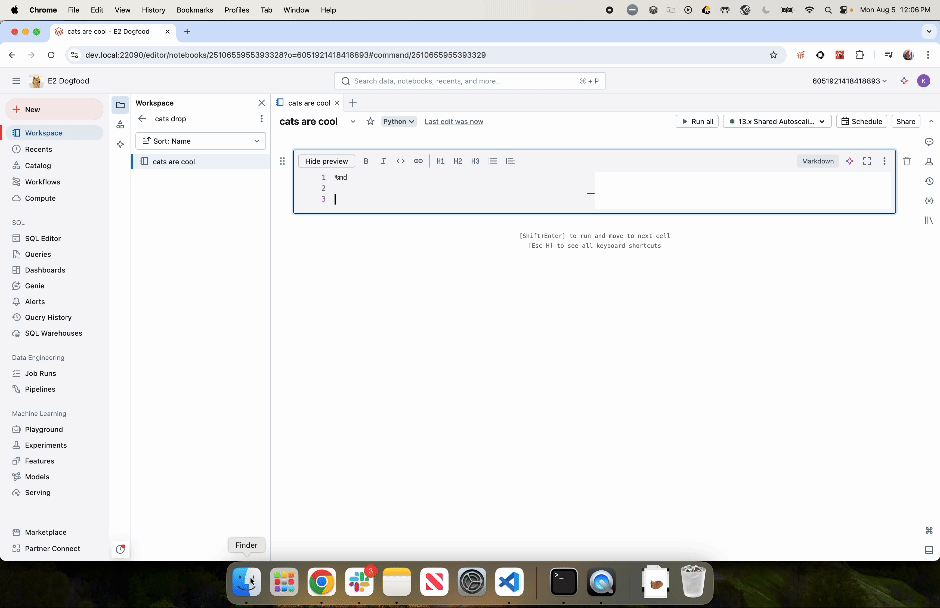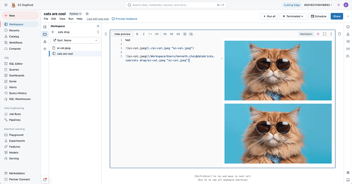 私たちは、よりユーザーフレンドリーで標準的なマークダウン形式でマークダウンセルに画像を埋め込む機能を追加しました。今では、顧客は相対パスと絶対パスの両方で画像を埋め込むことができます(ワークスペースファイルの場合は/Workspace、ボリュームファイルの場合は/Volumes)。これにより、顧客はデータの視覚化、画像トレーニング、またはネコのコミックリリーフのために、ノートブックに画像を導入する際の柔軟性が増します。
