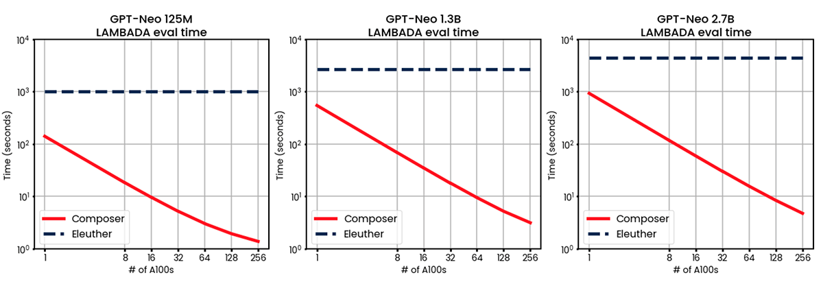HuggingFaceからダウンロードしたGPT-Neo 125M、1.3B、および2.7Bパラメータモデルを、1、8、16、32、64、128、および256のA100-40GB GPUで事前にトレーニングした上で、ComposerベースのICL evalの実行時間を測定しました。 ベースラインとしてEleutherAI/lm-evaluation-harnessを使用しました。