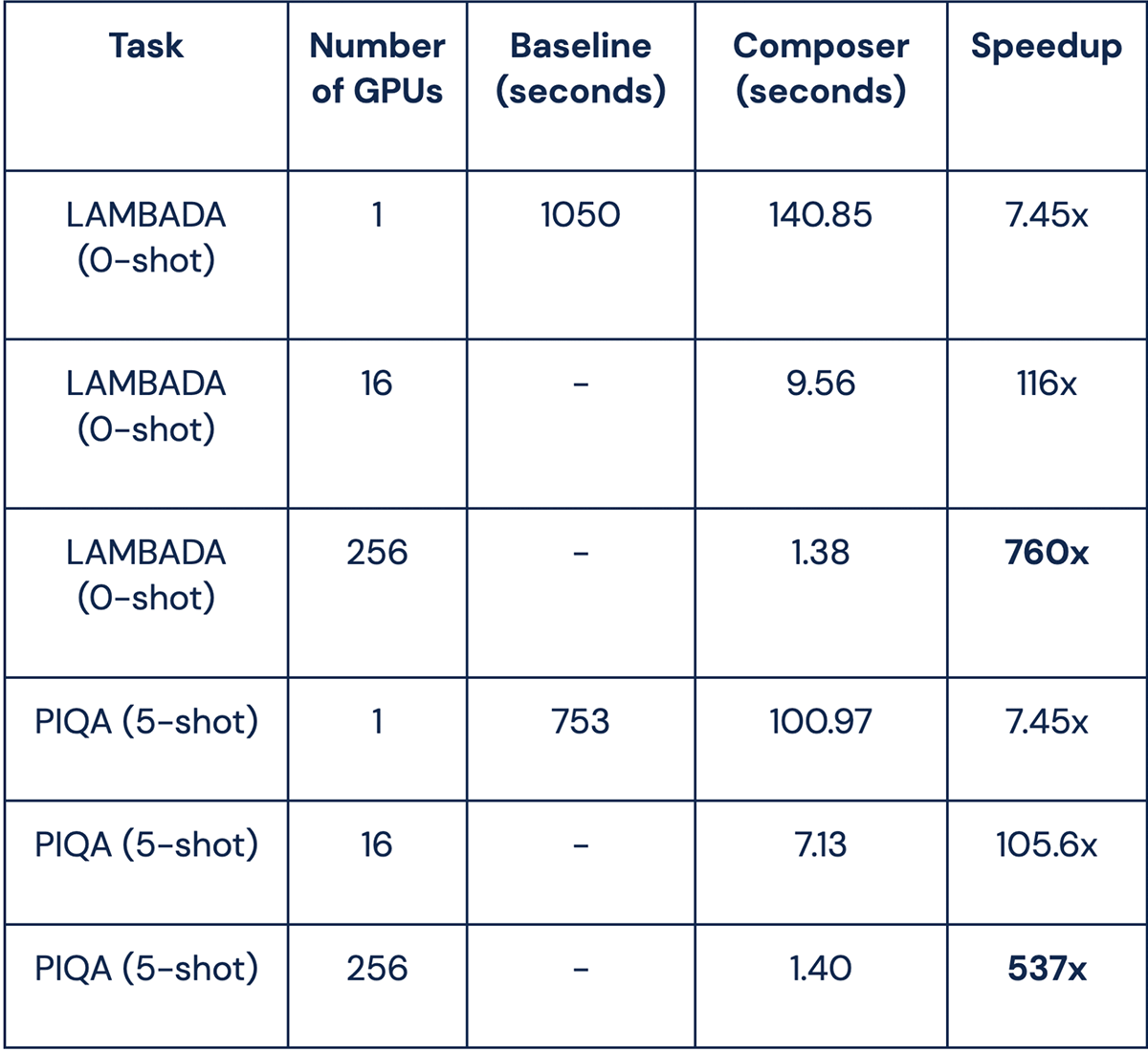 最新のComposerリリース(0.12.1)では、言語モデリングの効率を改善しました。 LAMBADAや質問応答(例:PIQA)のICLタスクを実行し、シングルA100 GPUで7.45倍のスピードアップを実現しました。 また、ComposerのネイティブなマルチGPU推論サポートとFSDPモデルシャーディングを使用して、GPU数に応じて実行時間をリニアにスケーリングし、1.2Tパラメータを超えるモデルサイズをサポートします。