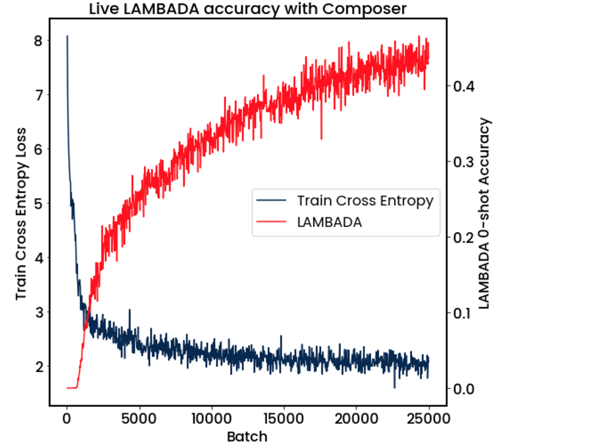 Figure 4 - Measuring 0-shot LAMBADA accuracy during training: Using our ICL evaluator in Composer, we run LAMBADA evaluation every 25 batches during GPT-1B training.