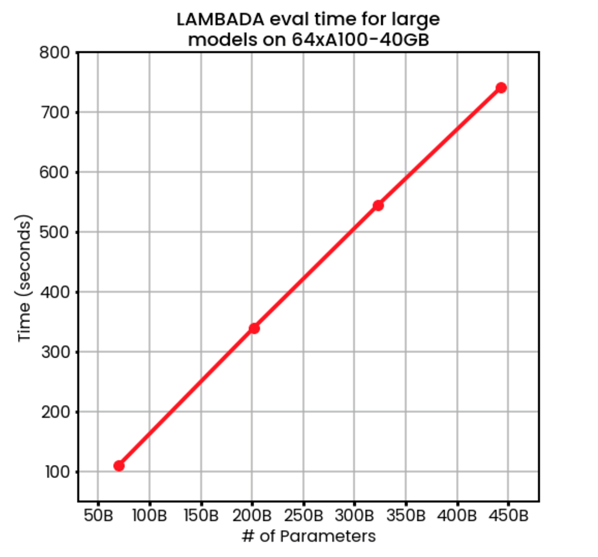 Figure 5 - Evaluating huge models with Composer + FSDP: With Composer + FSDP we run LAMBADA on models up to 450B parameters on 64 A100-40GB GPUs. The evaluation time scales linearly with the number of parameters in the model.