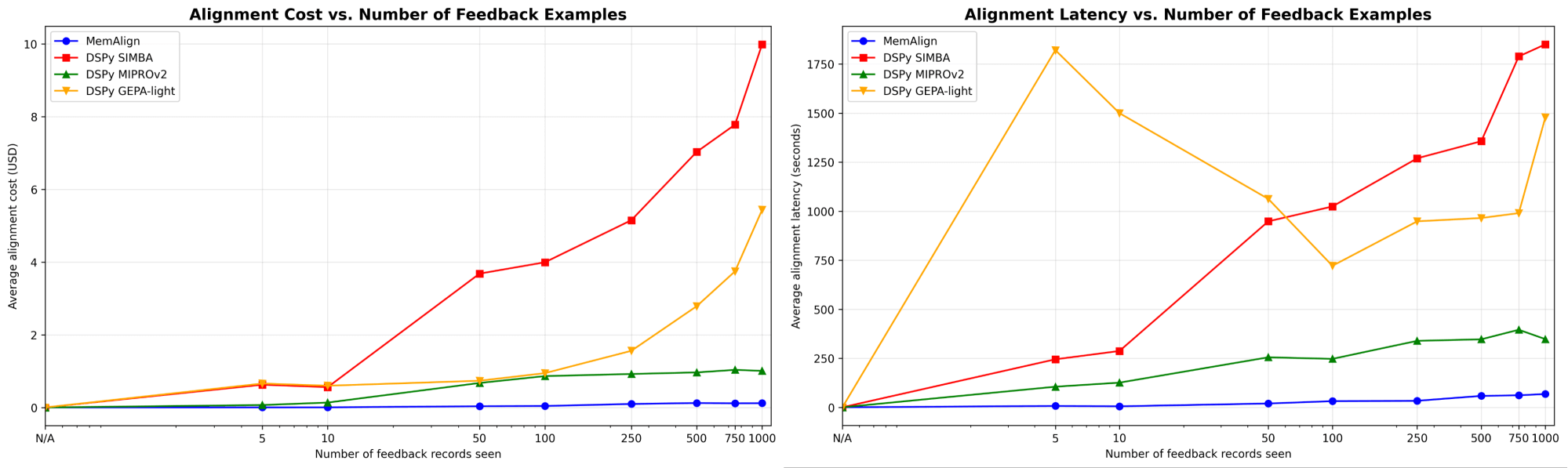 Figure 3. Alignment speed and cost vs. the number of feedback examples of MemAlign vs. prompt optimizers from the DSPy family.