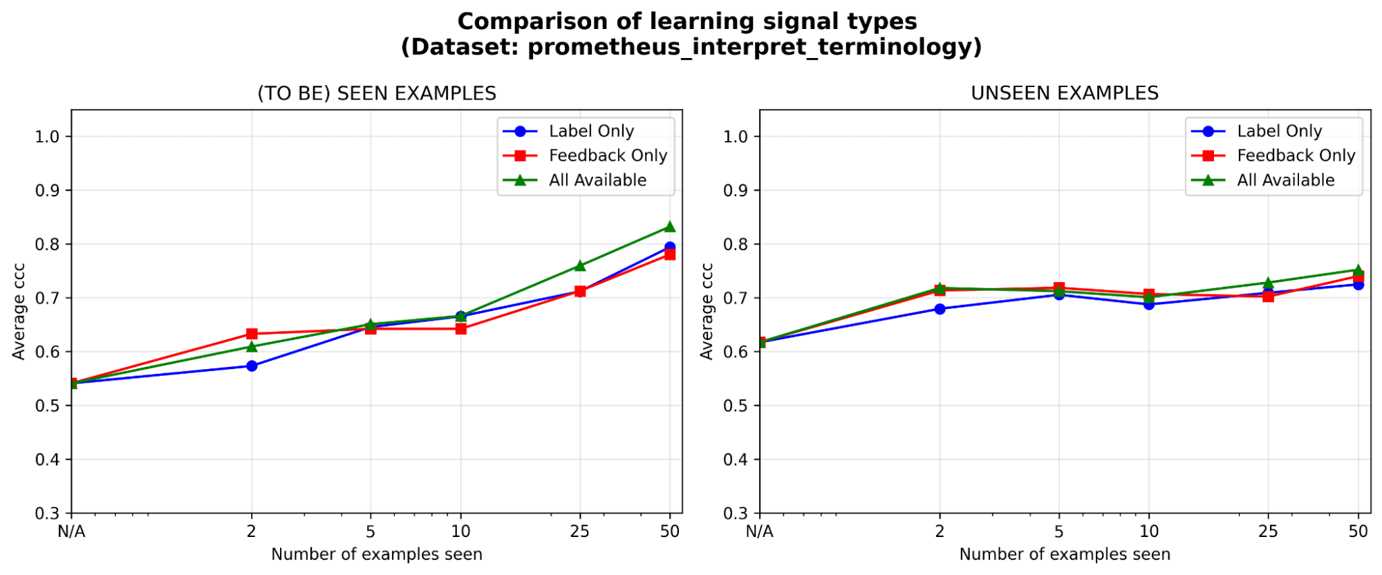 特に初期段階では、フィードバックは少なくともラベルと同等の効果があります。一定のアノテーション予算が与えられた場合、ラベル、自然言語フィードバック、あるいはその両方のうち、どのタイプの学習シグナルに投資するのが最も価値があるでしょうか?初期段階(5 例以下)では、ラベルよりもフィードバックにわずかな優位性が見られますが、例が蓄積されるにつれてその差は縮まります。つまり、専門家が数例しかレビューする時間がない場合は、その理由を説明してもらう方が効果的かもしれません。そうでなければ、ラベルだけでも十分な可能性があります。