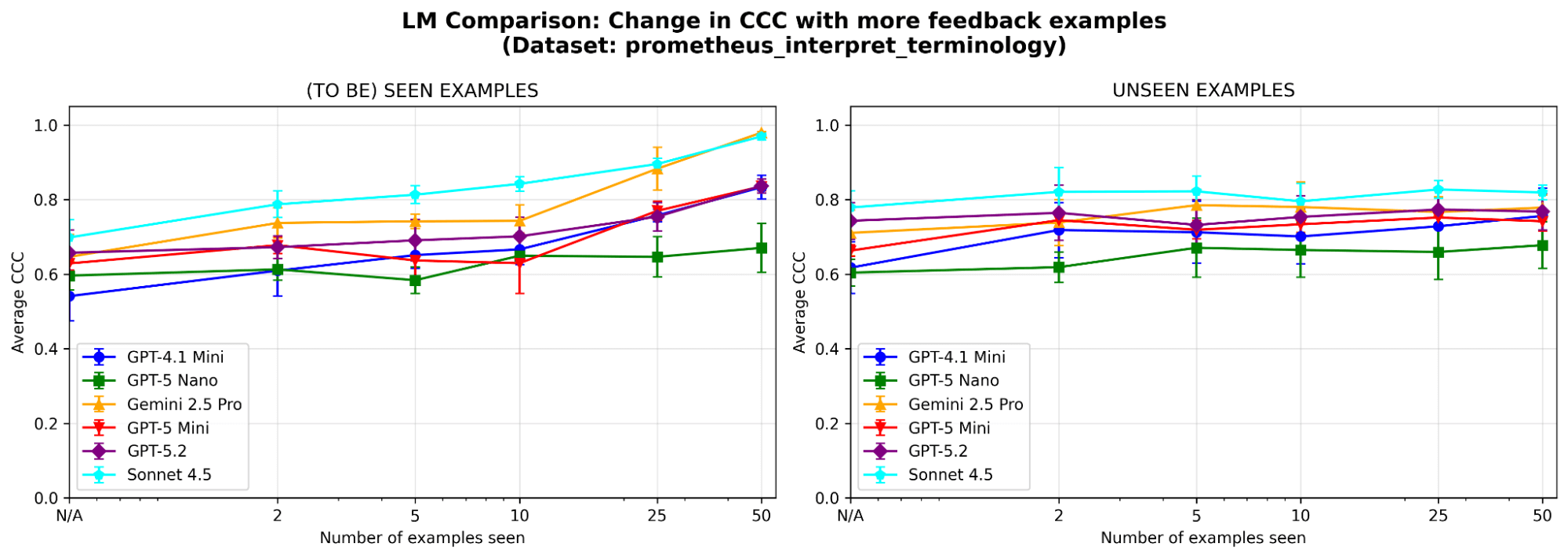 MemAlign は LLM の選択に影響されますか?さまざまなファミリーとサイズの LLM を使用して MemAlign をランします。全体として、Claude-4.5 はSonnet のパフォーマンスが最も優れています。しかし、より小規模なモデルでも大幅な改善が見られます。例えば、GPT-4.1-mini は当初は低い性能ですが、50 の例を見た後では、GPT-5.2 のような最先端モデルの性能に匹敵します。これは、価値を得るために高価な最先端モデルに縛られる必要がないことを意味します。