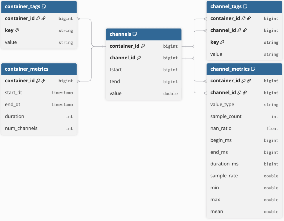 ベンチマークは、データモデルの2つの主要バージョンで実行されました。最初のバージョンにはランレングス符号化(RLE)されたサンプルデータがありますが(「コアデータモデル」のセクションを参照)、2番目のバージョンではRLEを使用していません。さらに、データモデルの両方のバージョンに2つの異なるデータレイアウト最適化を適用しました。最初の最適化では、Hive形式のパーティショニングを使用して計測シグナルデータテーブルをmeasurement_session_id列でパーティション分割し、signal_id列にZ-Orderingテクニックを適用しました。2番目の最適化では、Liquid Clusteringを使用して計測シグナルデータテーブルをmeasurement_session_idとsignal_idでクラスタリングしました。