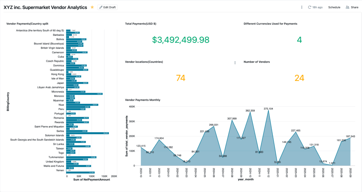 マテリアライズドビューが作成されると、チームがベンダーの支払い、未払い残高、地域別の支出を視覚化できるAI/BIダッシュボードで直接探索できます。これらは動的なフィルタリング、検索、コラボレーションをサポートしており、すべてUnity Catalogによって管理されています。Genieは、同じデータの自然言語による探索を可能にします。