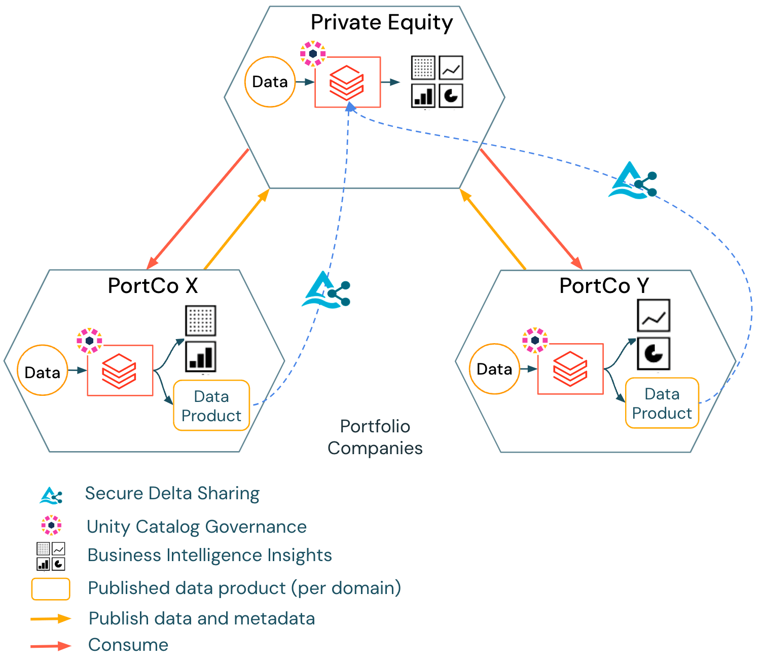 本質的には、以下のアーキテクチャ図に示されているように、プライベートエクイティとそのポートフォリオ企業は、Databricks Intelligence Platformを活用して高品質なデータ製品とAIモデルを構築し、Unity Catalogでそれらを大規模に管理し、オープンなDelta Sharingでデータ資産を安全に共有することで、ビジネス運営に対するリアルタイムの洞察を提供することができます。