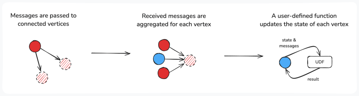 ユーザー定義関数(UDF)は、メッセージの送信方法や、受信したメッセージを使って頂点の状態をどのように更新するかを制御します。この柔軟性により、Pregelアルゴリズムはさまざまなユースケースに対応可能です。