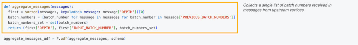 Pregelを使ってバッチトレーシングを実装するために、私たちはグラフに沿ってバッチ番号を送信したいと考えていました。まず、メッセージ構造を定義しました—私たちのものには、ノードの深さ、バッチ番号、および以前のバッチ番号(いわゆる「トレース」)が含まれていました。メッセージスキーマを定義した後、親から子バッチへのメッセージが送信されるように、各頂点の深さに基づいてUDFを作成しました。
