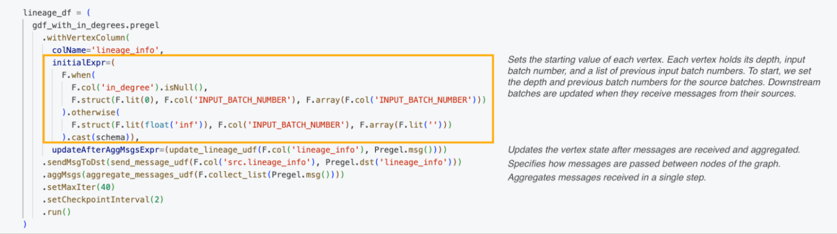 ソースバッチを見つけた後、私たちはPregelアルゴリズムを構築して、各エッジに沿ってバッチ番号を入力から出力まで送信し、すべてのバッチの完全な系譜をトレースしました。
