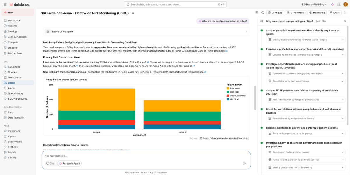 従来であれば、信頼性エンジニアと地表下チームはそれぞれ個別の分析を実行し、その後、結果を手動で照合しようとしていました。Databricks上でデータがすべて統合され、Genieを通じて公開されることで、システムは単一の複数ステップ分析で、故障モード、MTBF(平均故障間隔)、層への露出、泥の特性、およびメンテナンス履歴を相関させます。