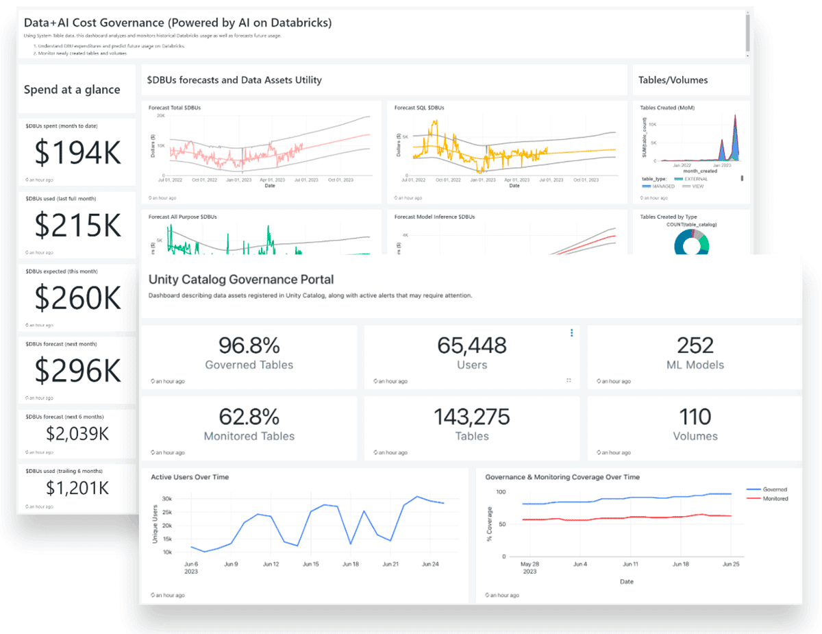以下のダッシュボードの例では、ユーザ数、テーブル数、MLモデル数、監視対象テーブルの割合、Databricks DBUに費やされた金額などが表示されます:
