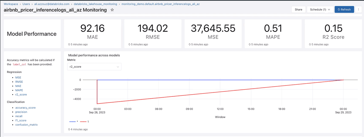 また、R2、RMSE、MAPEなどの様々なML メトリクス、指標に従って、時間の経過に伴うパフォーマンスをモデル化します: