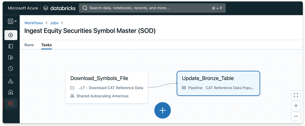 Databricksワークフローは、取引開始時にファイルが公開されるたびに、CAT株式シンボルデータセットへの入力を開始します。