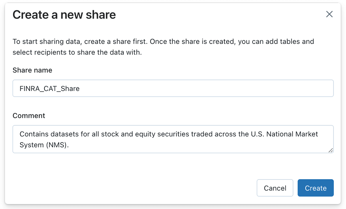 シンボルファイルの更新を取引日ごとに取り込むストリーミングパイプラインを作成したので、Delta Sharing を利用して Delta Table をデータ受信者と共有することができます。Databricks Lakehouse PlatformでDelta Shareを作成するには、ボタンを数回クリックするか、SQL構文を使用する場合は1つのSQL statementで作成することができます。