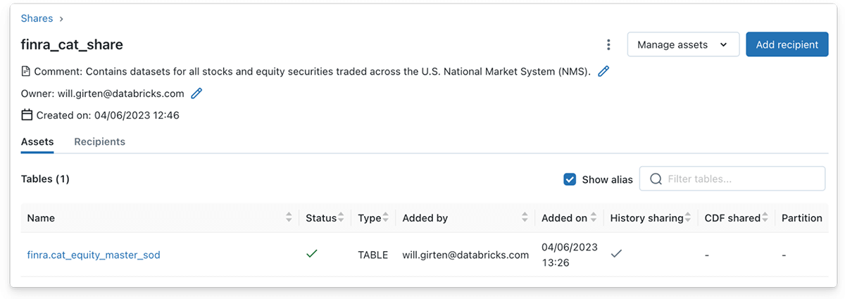同様に、データプロバイダーは、'Manage assets' ボタンをクリックし、次に 'Edit tables' ボタンをクリックすることで、デルタシェアに 1 つまたは複数のテーブルを入力することができます。この場合、株式シンボルデータを含むブロンズデルタテーブルがシェアオブジェクトに追加されます。