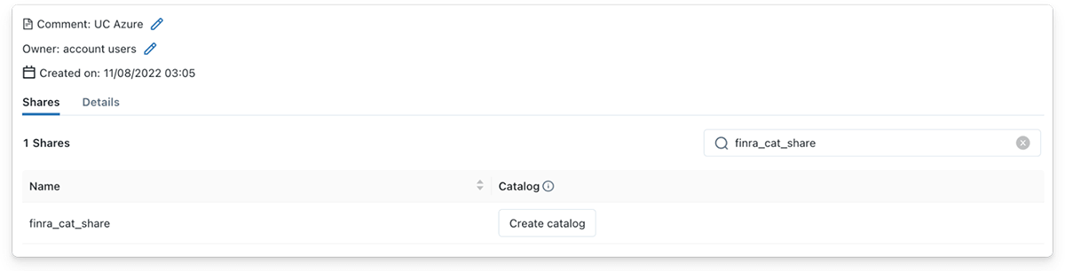 データ受信者として、共有されたDeltaテーブルからのストリーミングは、同様にシンプルです!Delta Shareがデータ受信者と共有されると、受信者はすぐにUnity Catalogのプロバイダ詳細の下にShareが表示されるのを確認します。その後、データ受信者は、「カタログの作成」ボタンをクリックして、Unityカタログで新しいカタログを作成し、意味のある名前を指定し、オプションのコメントを追加して、シェアの内容を説明することができます。