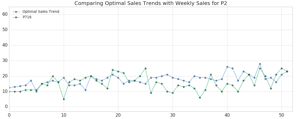 이제 공장의 예상 생산량("최적 판매/영업 추세")에 가장 가까운 제품 목록을 개발했으므로 DTW 거리가 작고 절대 판매/판매 수치가 유사한 제품으로 필터링할 수 있습니다. 한 가지 좋은 후보는 DTW 거리가 6.86이고 모집단 중앙값 거리가 7.89이고 최적 추세를 매우 밀접하게 추적하는 제품 #202입니다.