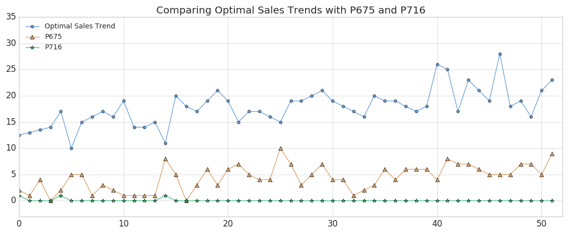 이 query실행 후 최적의 판매 / 영업 트렌드에서 가장 먼 제품 코드에 대한 해당 query 와 함께 트렌드에서 가장 가깝고 2 개의 제품을 식별 할 수있었습니다. 이 두 제품을 모두 플로팅하고 어떻게 다른지 살펴보겠습니다.