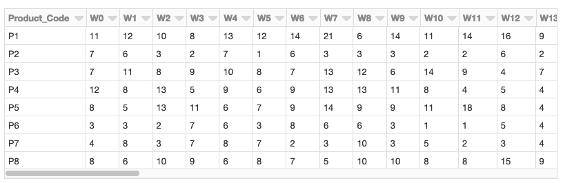 각 제품은 행으로 표시되고 연도의 각 주는 열로 표시됩니다. 값은 매주 판매되는 각 제품의 단위 수를 나타냅니다. 데이터 세트에는 811개의 제품이 있습니다.