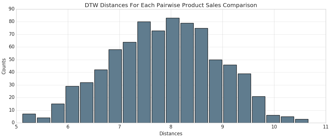 보시다시피 제품 #675(주황색 삼각형으로 표시)는 최적의 판매/영업 추세와 가장 잘 일치하지만 절대 주간 판매/영업은 원하는 것보다 낮습니다(나중에 수정하겠습니다). 이 결과는 DTW 거리가 가장 가까운 제품에 비교하는 메트릭을 어느 정도 반영하는 최고점과 최저점을 가질 것으로 예상하기 때문에 의미가 있습니다. (물론 제품의 정확한 시간 인덱스는 동적 시간 왜곡으로 인해 주별로 달라질 수 있습니다.) 반대로, 제품 #716(녹색 별표로 표시)은 변동성이 거의 없는 최악의 일치를 보이는 제품입니다.
