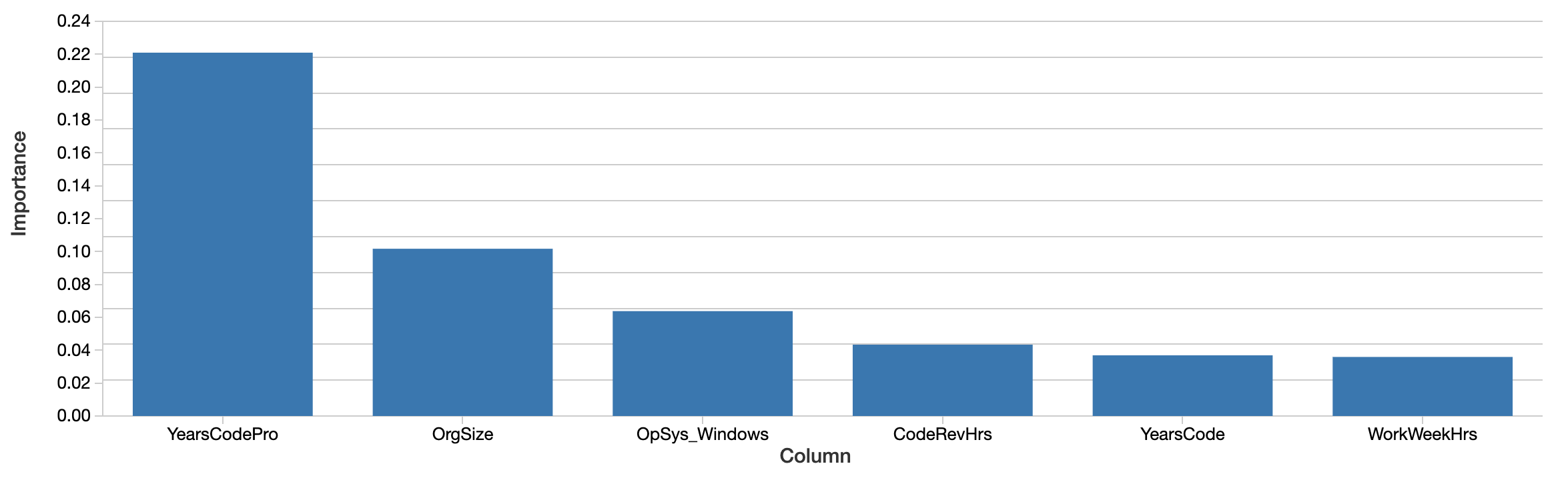 전문적인 코딩 경력, 조직 규모, Windows 사용과 같은 요인이 가장 "중요합니다". 이는 흥미롭지만 해석하기는 어렵습니다. 이 값은 절대적인 중요성이 아닌 상대적인 중요성을 반영합니다. 즉, 효과가 달러로 측정되지 않습니다. 여기서 중요도의 정의(총 이득)는 의사 결정 트리가 구축되는 방식에 따라 결정되므로 직관적으로 해석하기 어렵습니다. 중요한 특성이 반드시 급여와 양의 상관관계를 갖는 것도 아닙니다.