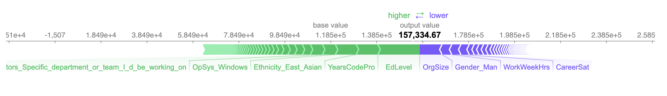 여성으로 식별되고 PostgreSQL을 사용하는 것은 예측 연봉에 약간 긍정적인 영향을 미치는 반면, 동아시아인으로도 식별되는 것은 예측 연봉에 더 부정적인 영향을 미칩니다. 이 맥락에서 이렇게 세부적인 수준으로 이러한 값을 해석하기는 어렵지만, 이러한 추가 수준의 설명은 제공됩니다.