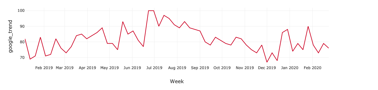 데이터 보강은 일회성 프로세스가 아닙니다. 잠재고객의 위치, 선호도, 행동과 같은 정보는 시간이 지남에 따라 변화합니다. 델타레이크를 활용하면 광고 데이터와 오디언스 프로필을 지속적으로 업데이트하여 데이터를 깨끗하고 관련성 있으며 유용한 상태로 유지할 수 있습니다. 마케터와 데이터 분석가는 고객과 함께 진화하는 보다 완벽한 소비자 프로필을 구축할 수 있습니다. 이 예에서는 배너 노출 수, 소셜 미디어 FB 좋아요 수, 웹 랜딩 페이지 방문 수 등이 있습니다. Spark SQL을 사용하면 다양한 데이터 스트림을 원본 데이터 프레임에 매우 쉽게 조인할 수 있습니다. 데이터를 더욱 풍부하게 하기 위해 Google 트렌드 API를 호출하여 자연 검색 요소를 나타내는 Google 트렌드 키워드 검색 인덱스를 가져옵니다(이 데이터는 Google 트렌드에서 가져온 것입니다).
