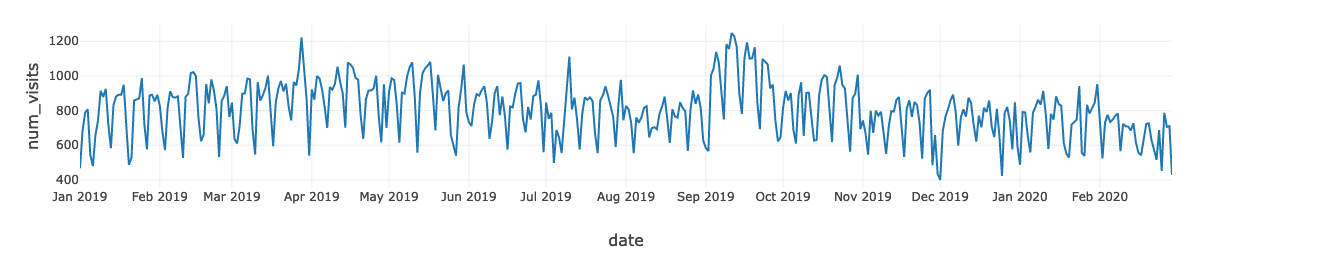 시계열 그래프는 다음과 같은 데이터에 대한 질문에 답할 수 있습니다: 시간이 지남에 따라 추세가 어떻게 변하는가? 또는 누락된 값이 있는가? 아래 그래프는 2019년 1월부터 2020년 2월까지 기간의 매장 내 방문을 보여줍니다. 매장 방문이 가장 많았던 시기는 2019년 9월 중순이었습니다. 해당 기간에 마케팅 캠페인이 진행되었다면 캠페인이 효과적이었지만 제한된 기간 동안만 진행되었다는 것을 의미합니다.