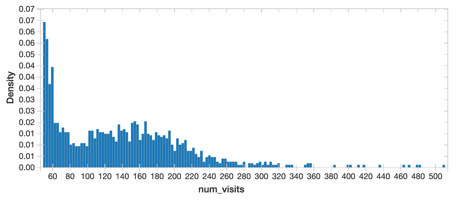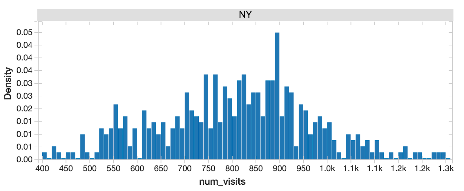 데이터 사이언스의 표준 단계로서, 대상 변수인 매장 방문의 확률 분포와 잠재적 특징을 이해하고자 하는데, 이는 모집단의 기본 특성을 암시하는 데이터의 가능한 모든 값(또는 구간)을 알려주기 때문입니다. 이 차트에서 모든 뉴욕주 매장 방문에 대해 다중 모드 분포를 나타내는 2개의 피크가 있음을 빠르게 확인할 수 있습니다. 이는 여러 세그먼트에서 인구의 근본적인 차이를 의미하며, 이를 더 자세히 분석해야 합니다.