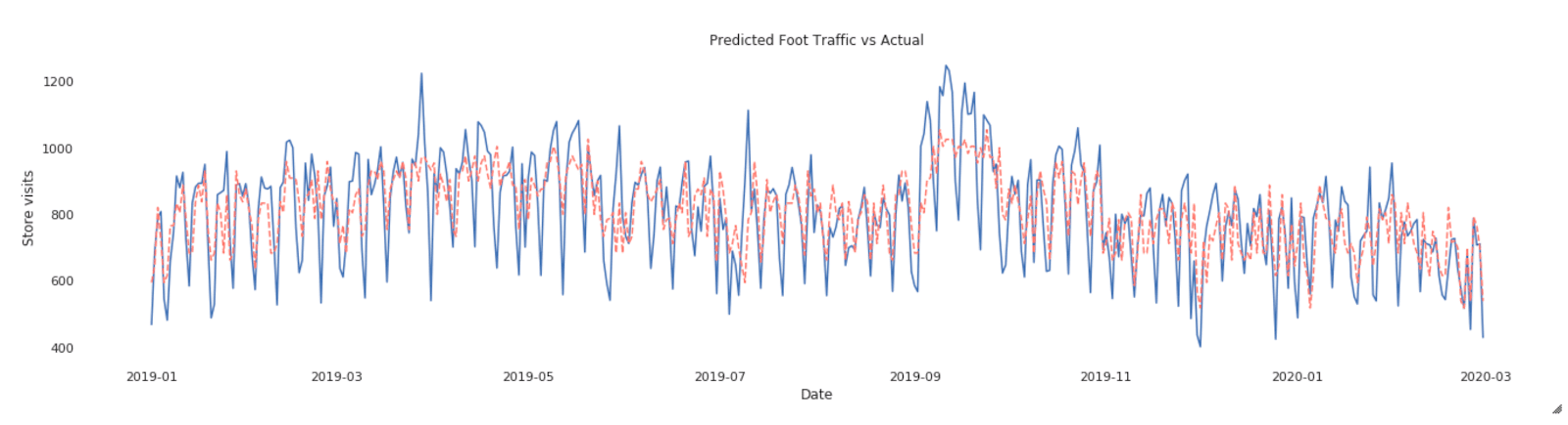 Spark_trials를 지정하면 HyperOpt가 자동으로 Apache Spark 클러스터 전체에 튜닝 작업을 배포합니다. HyperOpt가 최적의 파라미터 집합을 찾은 후에는, 모델을 한 번만 적합시키면 최적의 모델을 얻을 수 있습니다. 이는 수백 번의 모델 적합을 반복하고 교차 검증을 통해 최적의 모델을 찾는 것보다 훨씬 효율적입니다. 이제 적합한 모델을 사용해 뉴욕시 매장 내 트래픽을 예측해 봅시다: