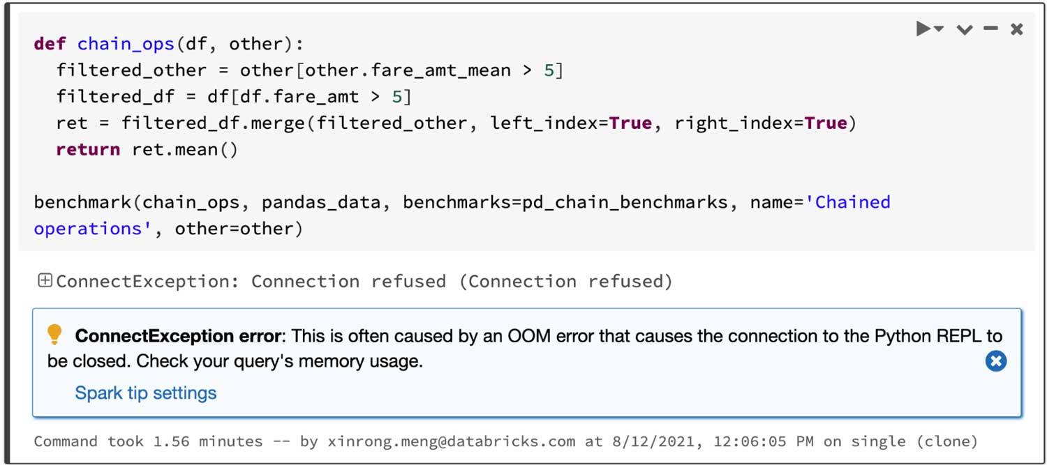 필터링된 두 프레임을 조인하고 조인된 프레임의 평균을 계산하는 쿼리의 경우 Spark의 pandas API는 4.5초 안에 성공하지만 pandas는 아래와 같이 OOM(메모리 부족) 오류로 인해 실패합니다.