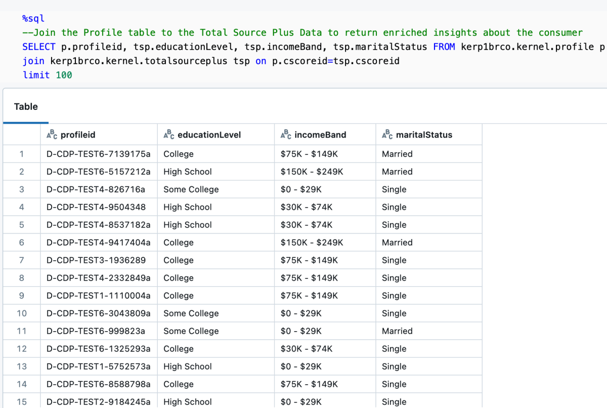 Databricks 마켓플레이스에서 Epsilon CDP 솔루션 가속기 를 확인해보세요. 이것은 소비자에 대한 통찰력을 풍부하게 하고 (결혼 상태, 소득, 교육 수준), 그 후 고객을 세분화하는 (생애 단계, 빈도, 최근성, 구매 금액) 노트북을 포함합니다.
