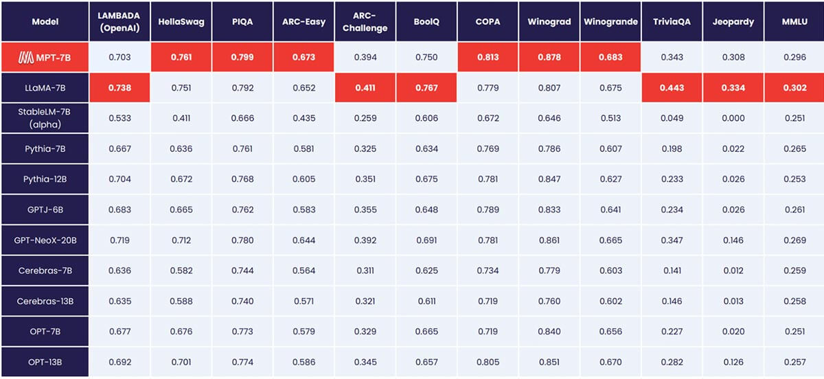 Table 1 - Zero-shot accuracy of MPT-7B vs. LLaMA-7B vs. other open source models on academic tasks. MPT-7B and LLaMA-7B have similar quality across all tasks, and each model scores highest (indicated in red) on 6 out of 12 tasks. Both models outperform other open source language models, even models with much larger parameter counts. All data was measured using the MosaicML LLM Foundry's in-context-learning (ICL) evaluation framework on checkpoints for each model. To ensure fair comparisons between models, no prompt strings or prompt tuning was used.