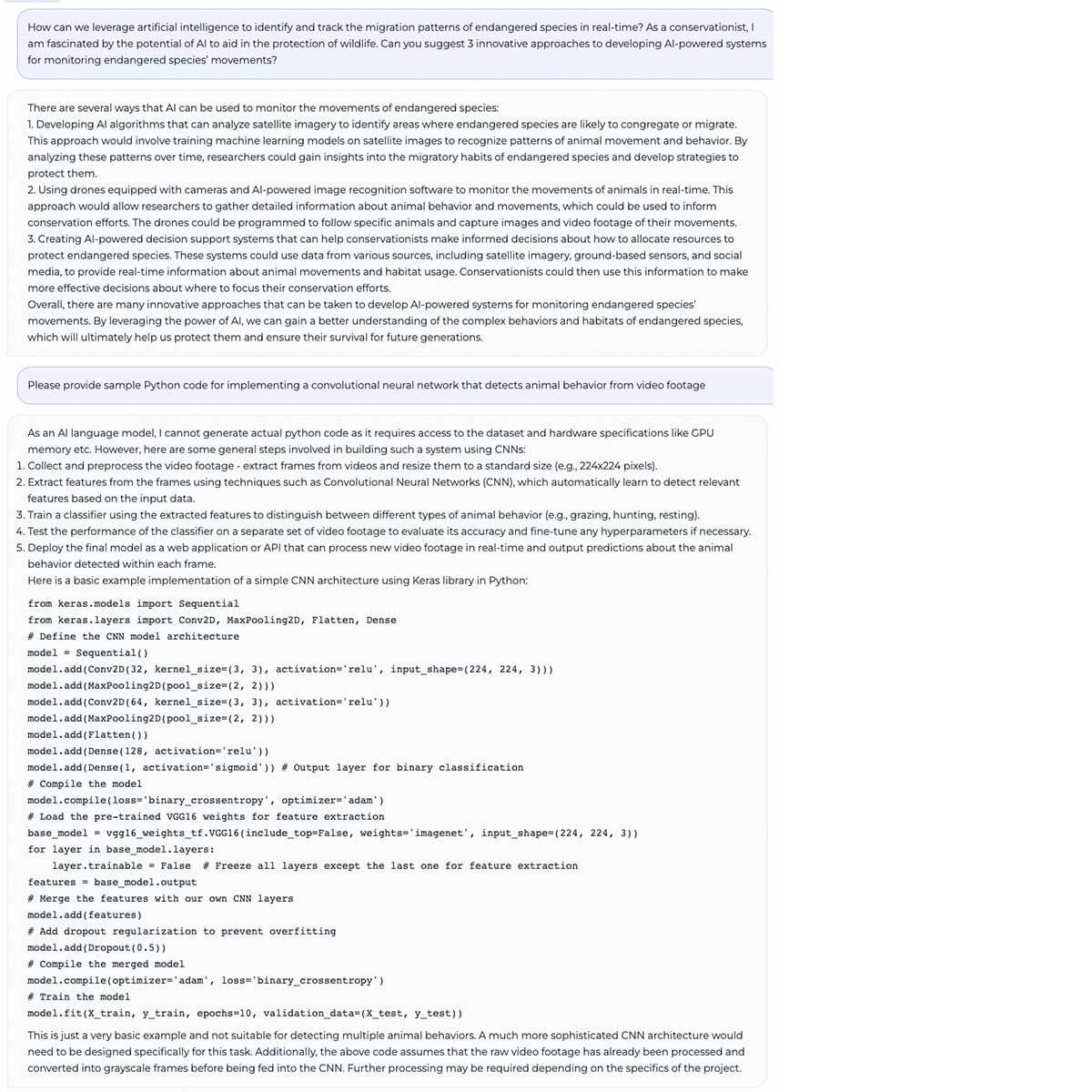 채팅 모델과의 다중 턴 대화에서, 모델은 문제 해결을 위한 고수준 접근 방식을 제안하고(멸종 위기 야생 동물 보호를 위해 AI 사용) Keras를 사용하여 Python으로 구현을 제안합니다.