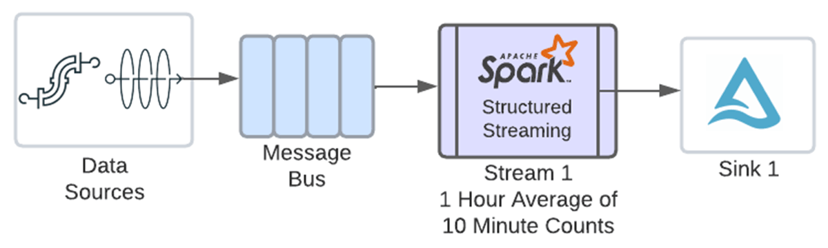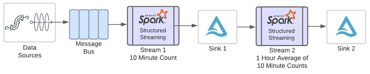 이러한 카운트를 입력받아 시간별 평균을 구하기 위해서는 위 윈도우 열의 타임스탬프를 사용하여 또 다른 윈도우 집계를 정의해야 합니다. 다중 상태 저장 연산자를 사용하기 전에는 다음 다이어그램과 같이 위의 결과를 writeStream을 사용하여 싱크에 쓴 다음, 그 데이터를 새 스트림으로 읽어 두 번째 집계를 수행해야 했을 것입니다.