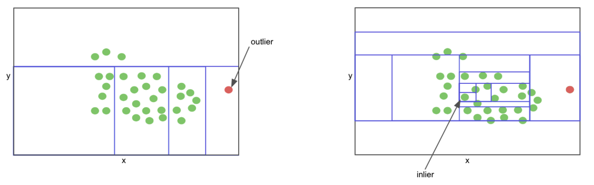 아웃라이어를 격리하는 것이 인라이어를 격리하는 것보다 쉽습니다.